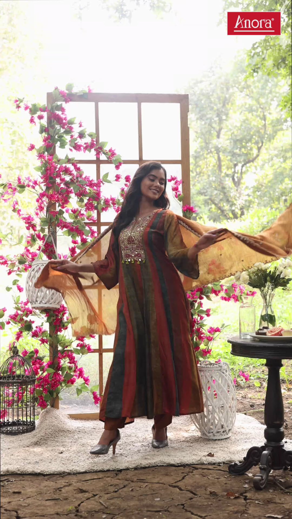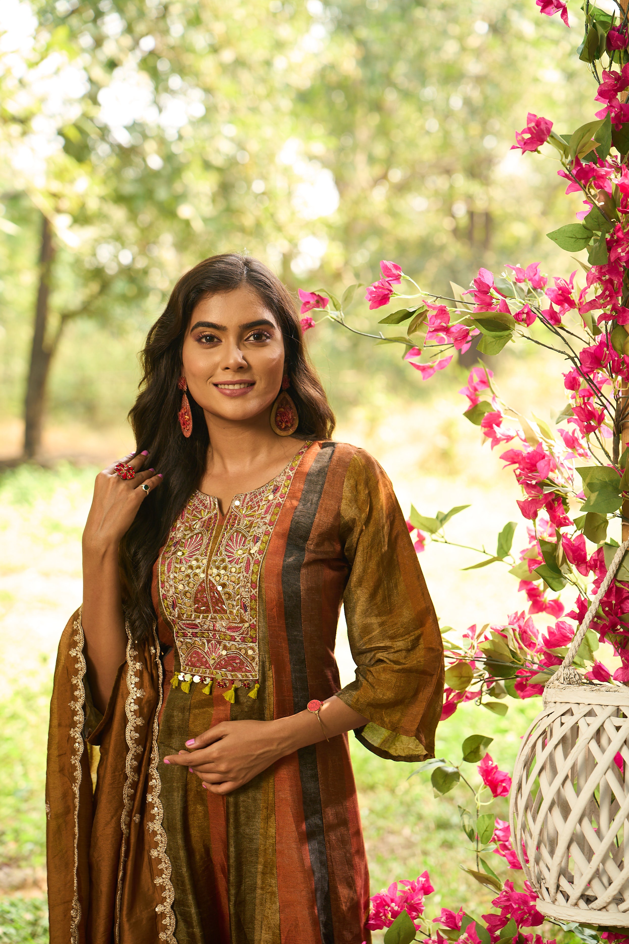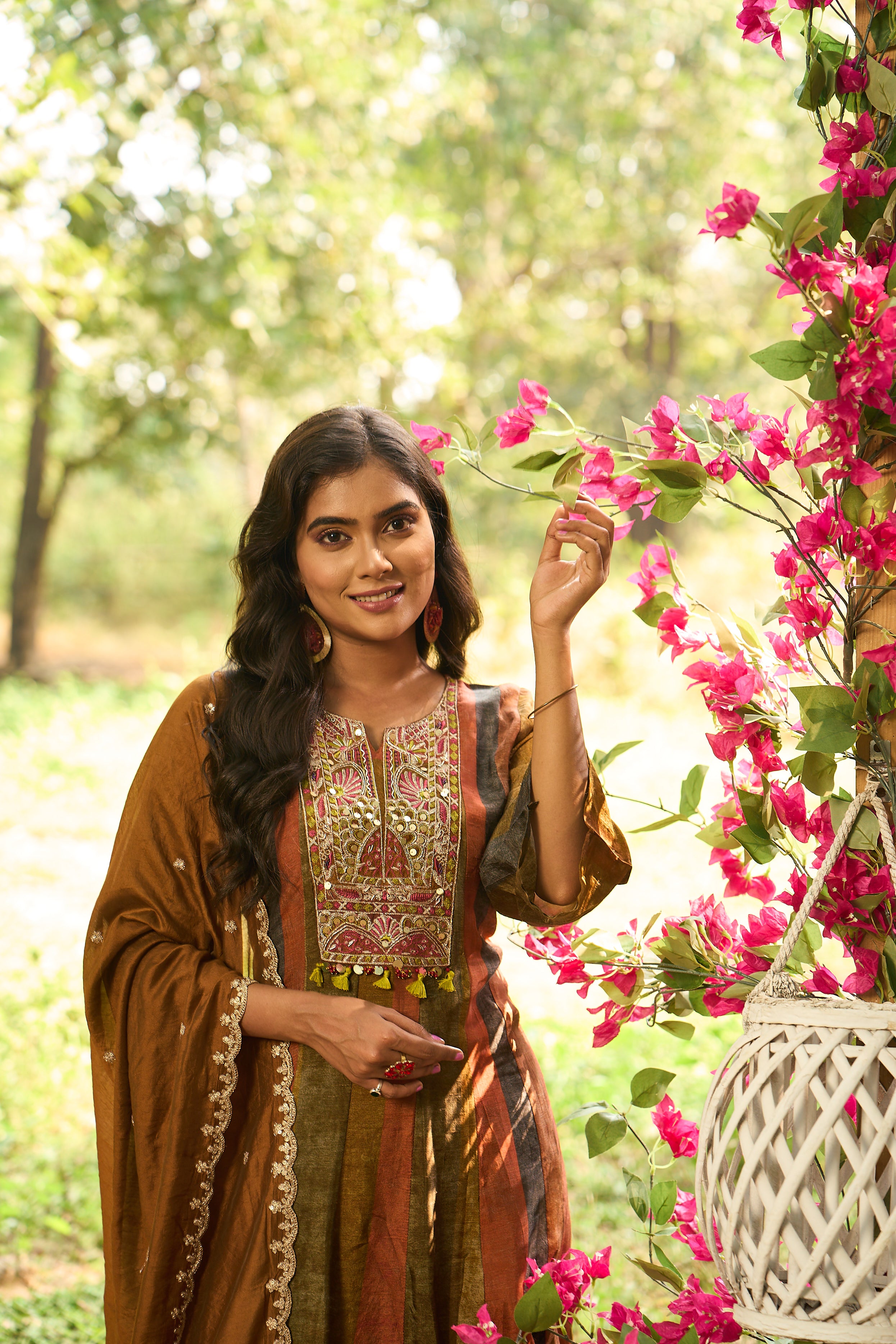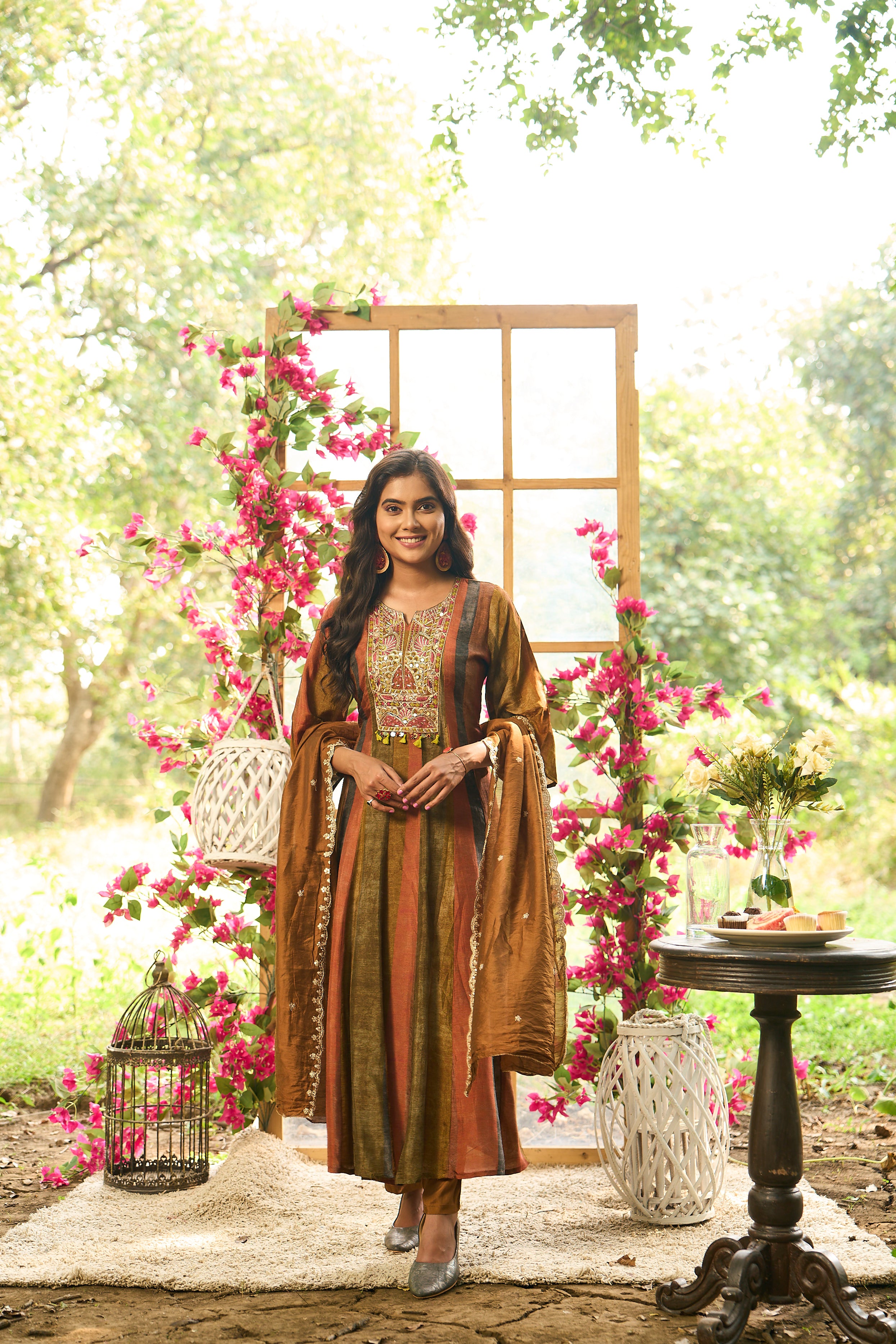 Multi Colour Silk Flared Kurta Set with Dupatta